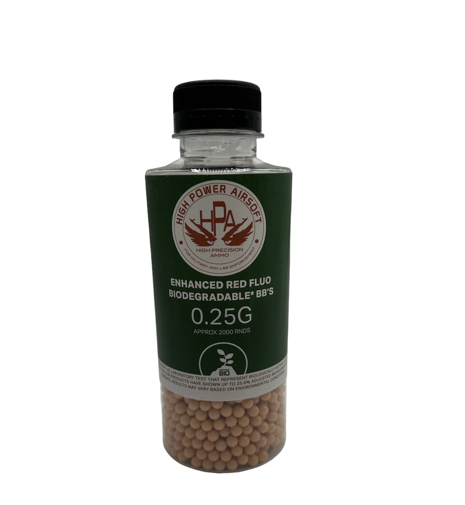 High Power Airsoft 0.25G FLUO RED BB is "The World's Best BB & With Truly Enhanced Biodegradability*. Tested in a U.S. Laboratory