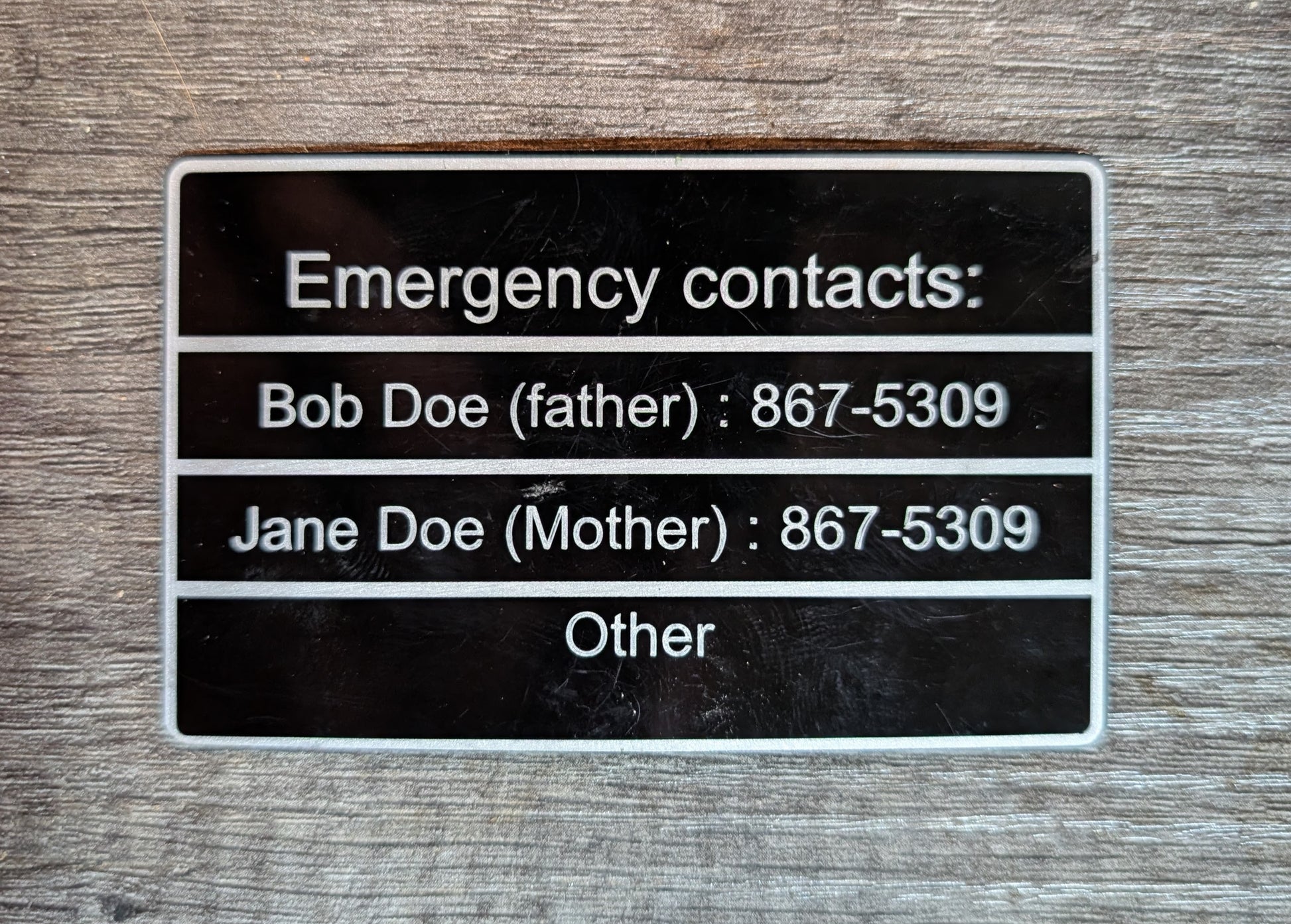 Customized laser engraved aluminum emergency contact cards. 2 for $5 or 5 for $10